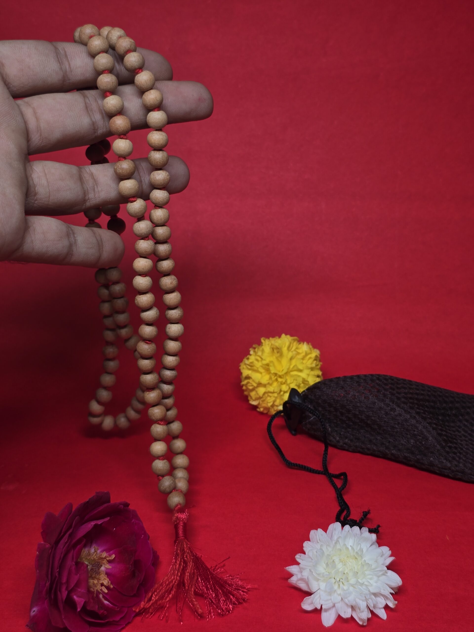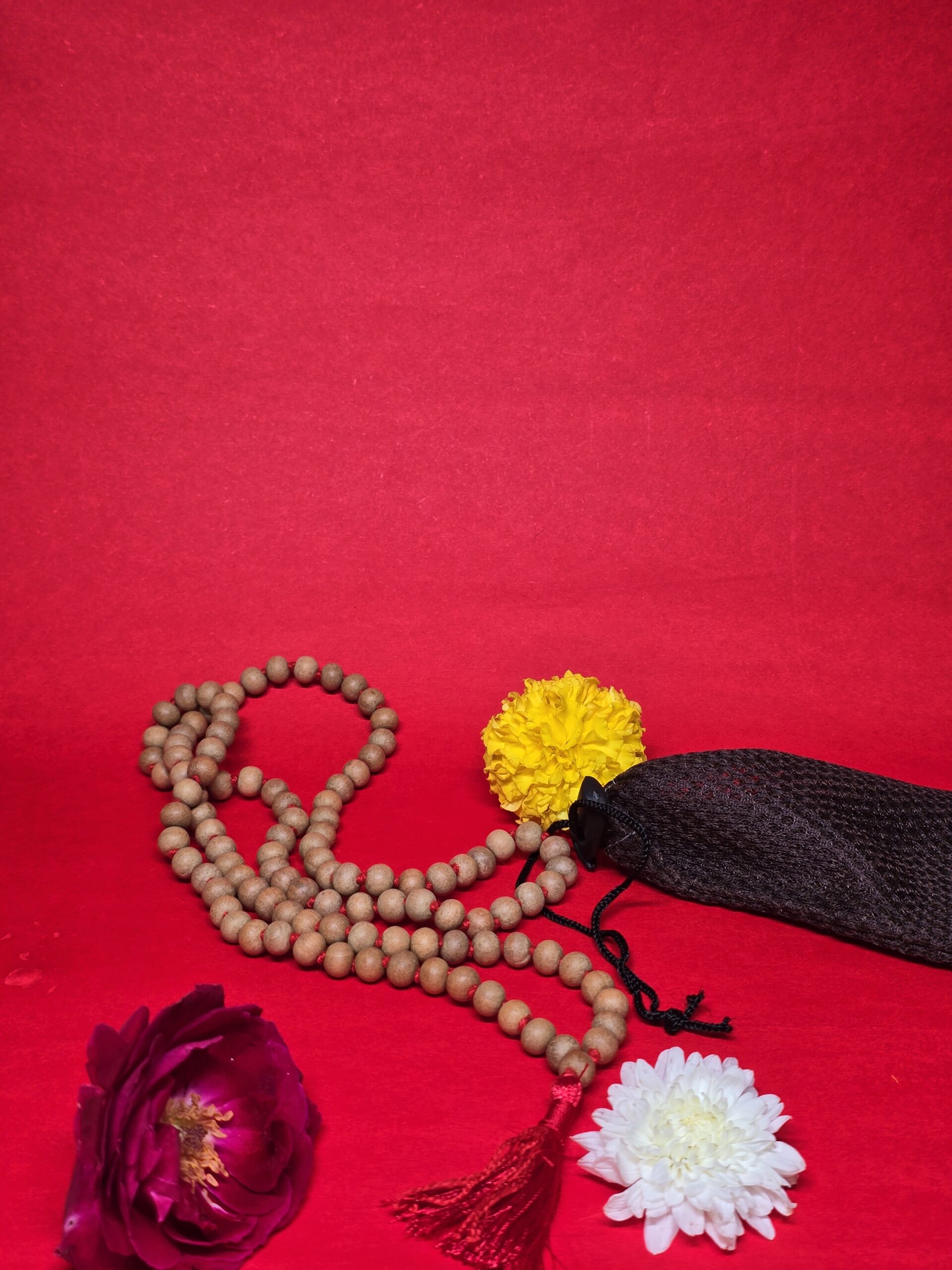 - The mala contains 108+1 beads and is finished with a vibrant red tassel, symbolizing devotion and energy. It comes with a black mesh pouch for safekeeping. The setup in the image includes red, yellow, and white flowers on a red background, reflecting purity, devotion, and spiritual strength.