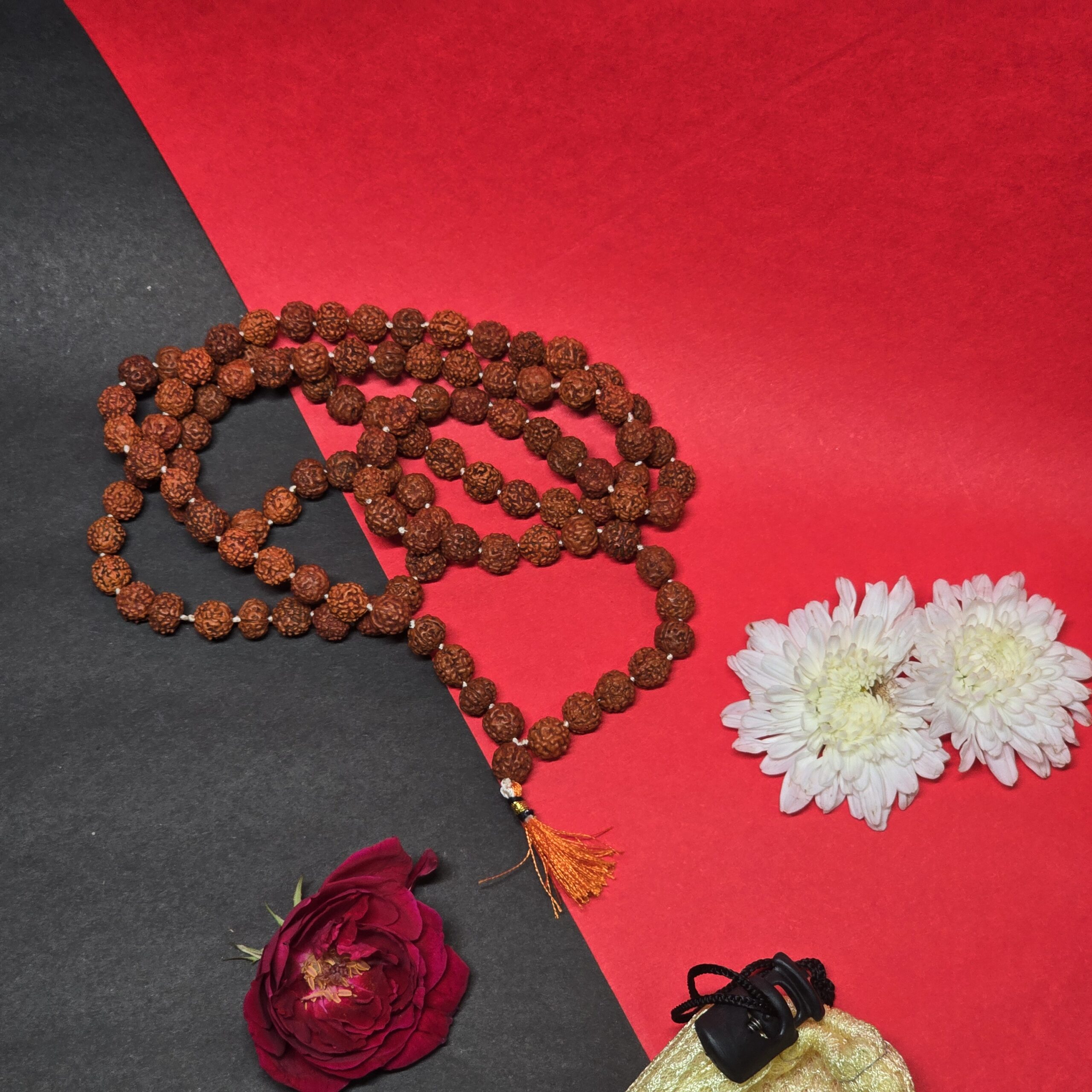 • The mala is placed against a striking red and black background, symbolizing energy and balance. Alongside the mala, fresh white chrysanthemums and a red rose add a touch of purity and love, while a golden pouch with a sacred black bead completes the divine setup.
