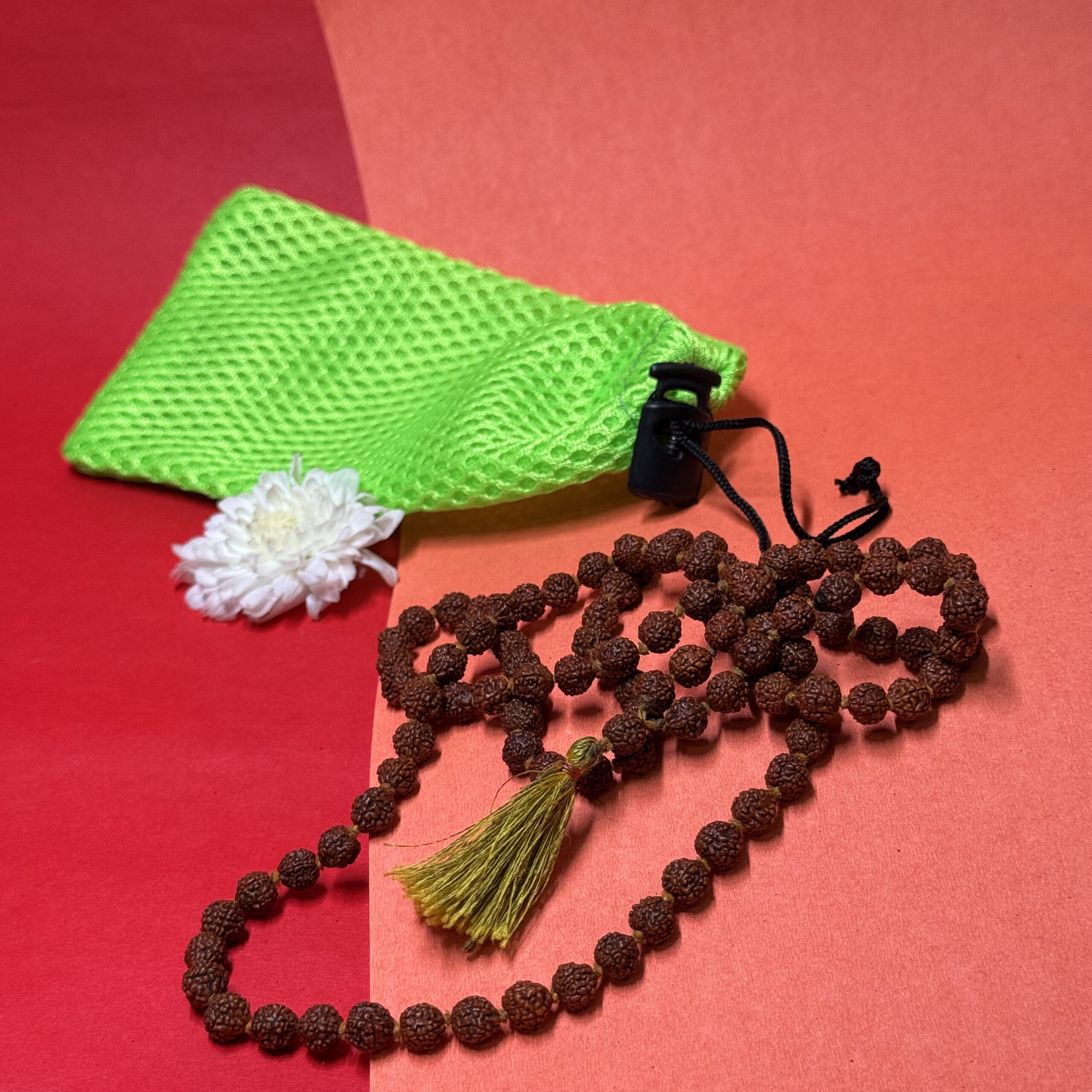 • This beautiful Rudraksha Mala is crafted from authentic, natural Rudraksha beads, symbolizing peace, power, and spiritual energy. Each bead is carefully strung together to form a 108-bead mala, traditionally used for meditation, chanting (japa), and prayer. The mala is finished with a vibrant orange tassel, representing purity and devotion.